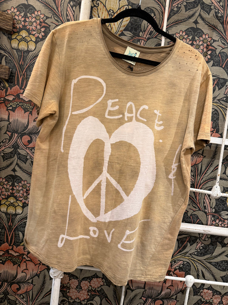 ✨ Tan dyed base✨ Graffiti-style Peace & Love graphic✨ Relaxed fit✨ Easy statement tee