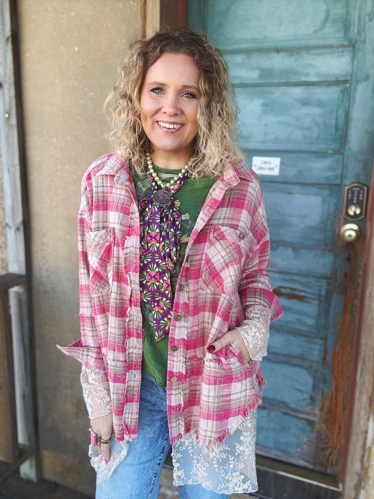Soft, romantic, and effortlessly layered — the Rosewater Reverie Plaid Top is a true Poetry Tea kind of piece. Featuring a relaxed, oversized plaid silhouette with delicate lace paneling at the hem and cuffs, this top blends cozy structure with feminine whimsy. The raw edges and washed finish give it that perfectly lived-in feel, while the lace details add just the right touch of bohemian charm.