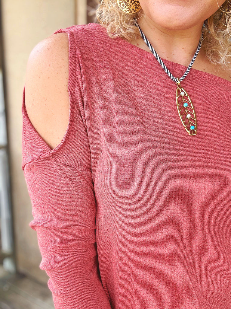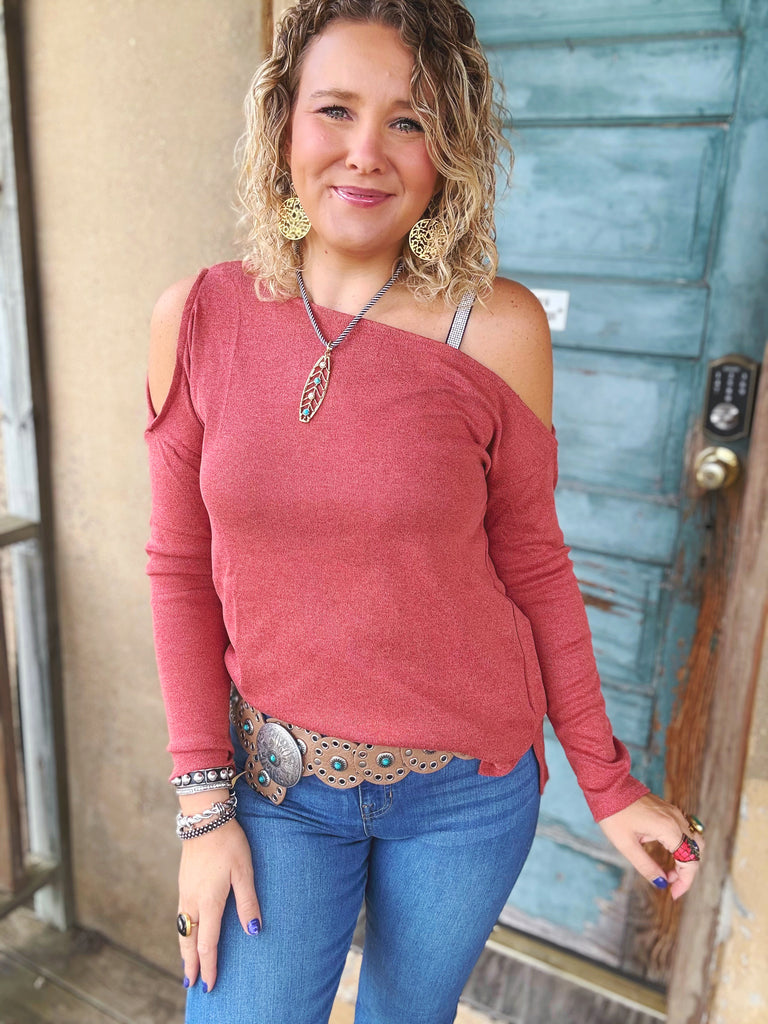 Bold yet effortless, the Sienna One-Shoulder Knit is your statement sweater for any season. Crafted in textured stretch knit, it features an asymmetrical neckline with one-shoulder detail that’s flirty while still offering coverage. The rich brick hue adds warmth, while the long sleeve balances the playful silhouette. Perfect with denim, skirts, or leather—this top is where cozy meets chic.