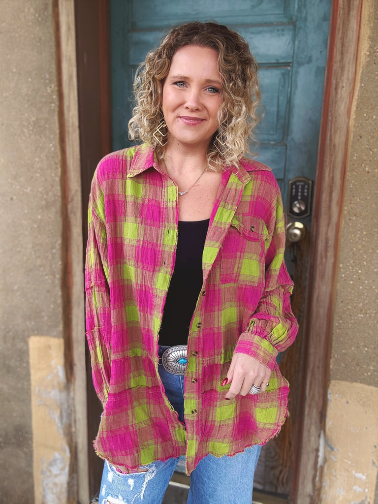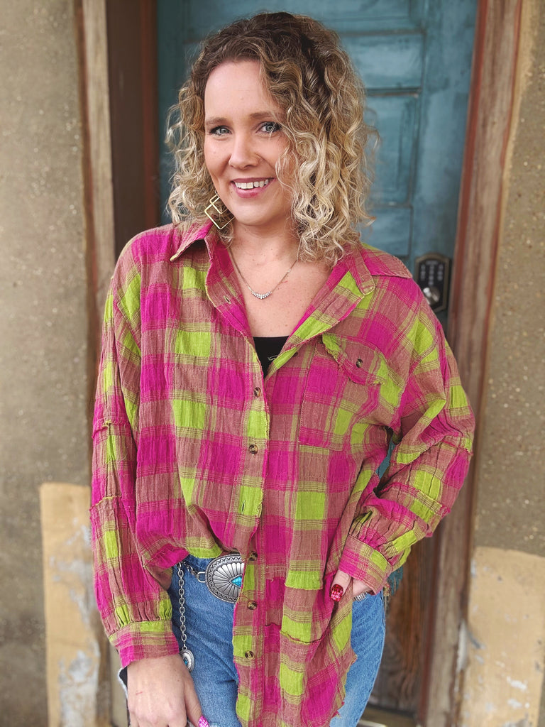 The multicolor plaid adds a cheerful pop that feels perfectly at home transitioning from winter layers to breezy spring days. Raw edge details, dropped shoulders, and billowy sleeves give it that lived-in, artsy vibe we love—easy, relaxed, and endlessly wearable.