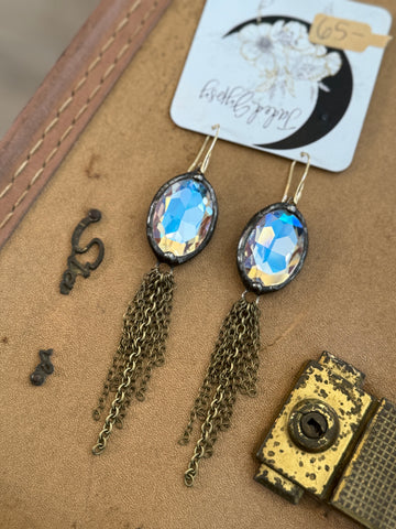 Turn up the boho drama with these mesmerizing Prism Cascade Statement Earrings from Jaded Gypsy. Each pair features a bold, faceted glass gemstone framed in hand-soldered metal with long, free-flowing antique brass chains that shimmer with every move.