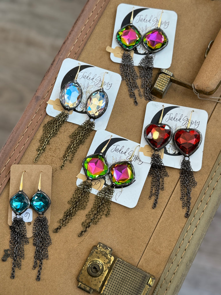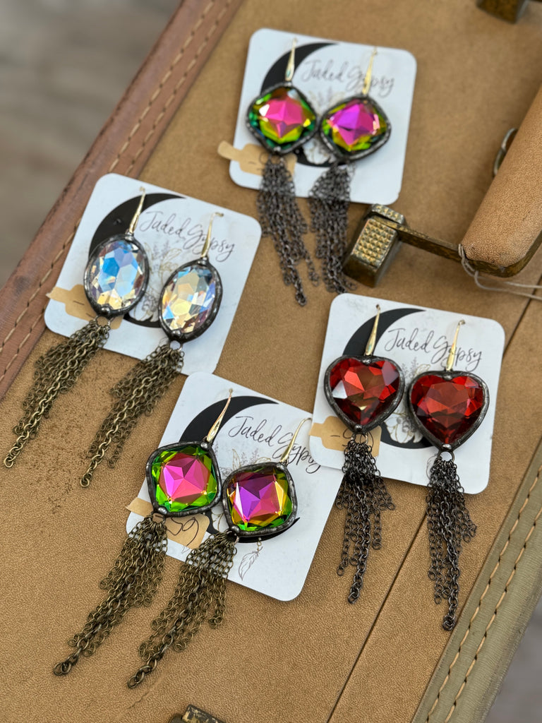 Every colorway has its own unique vibe — from fiery sunset tones to cool jewel hues — making each pair a little piece of wearable art. Lightweight for their size and full of that signature Jaded Gypsy magic, these beauties bring instant boho-glam energy to any look.