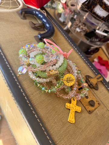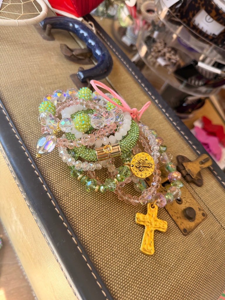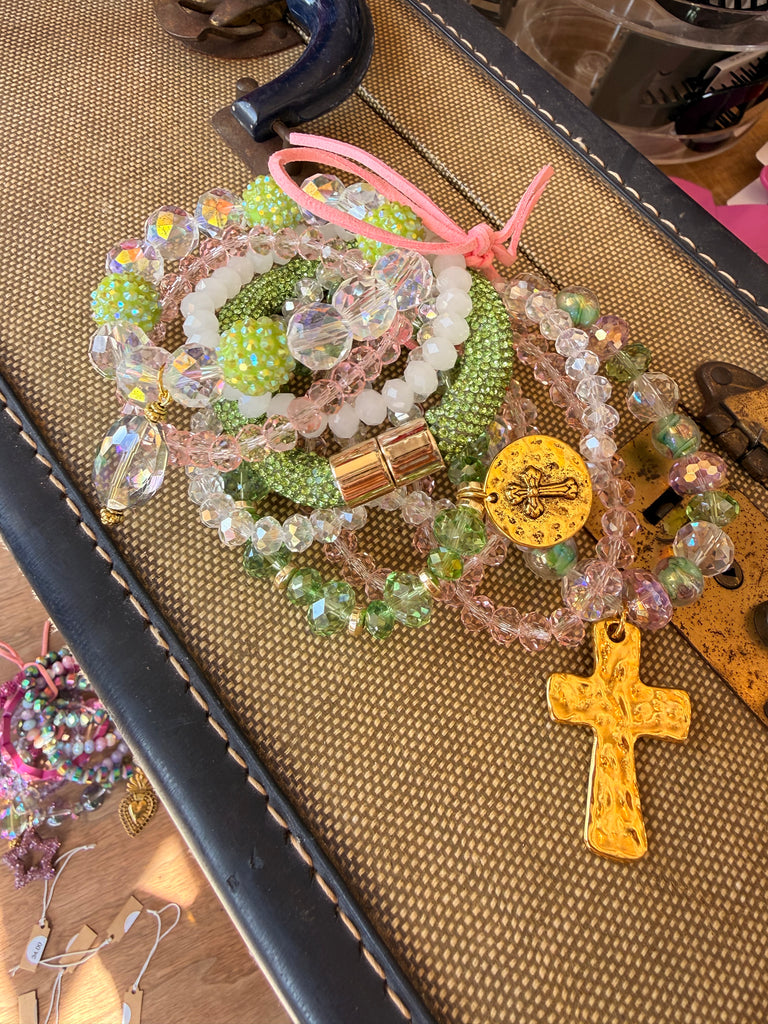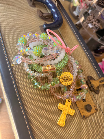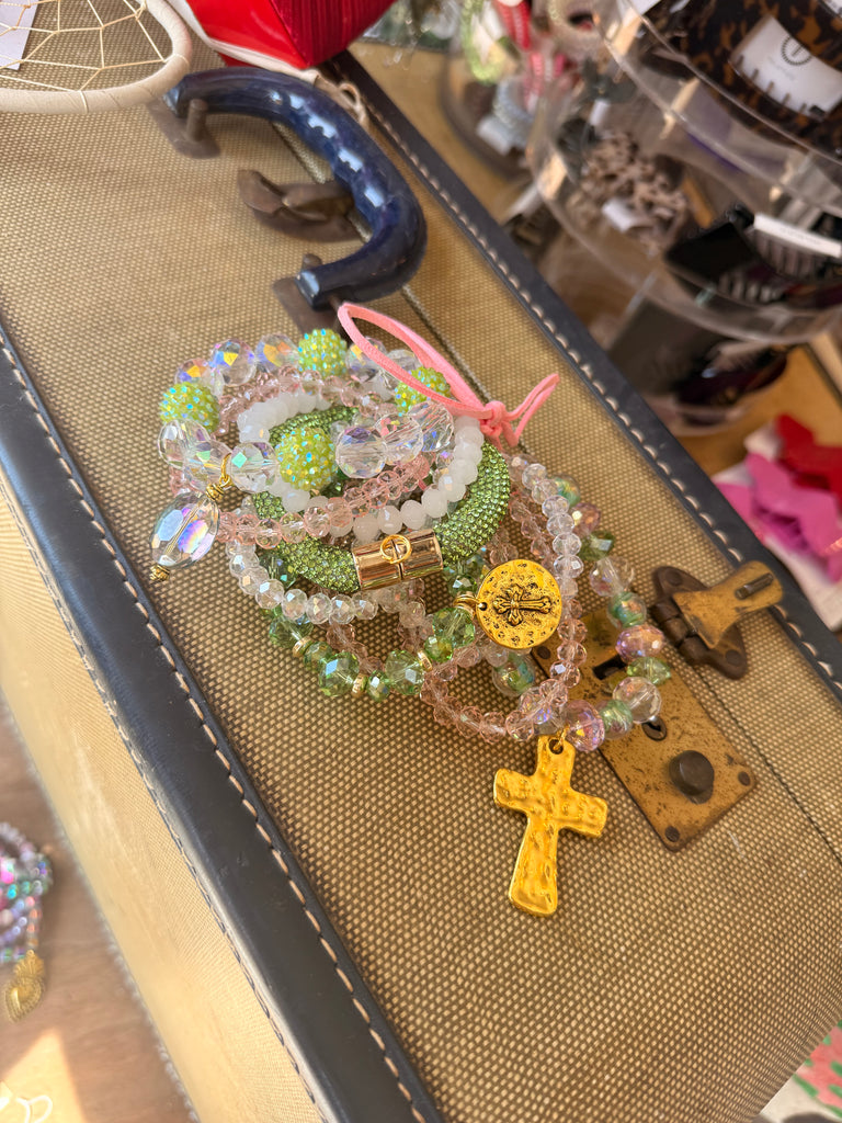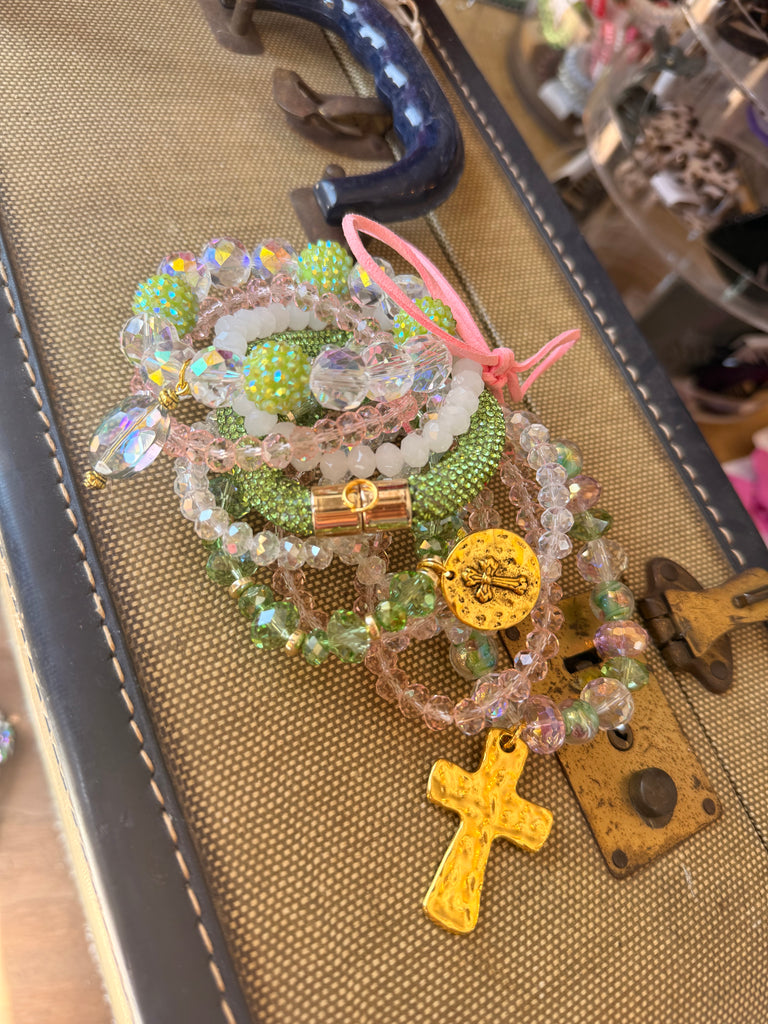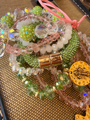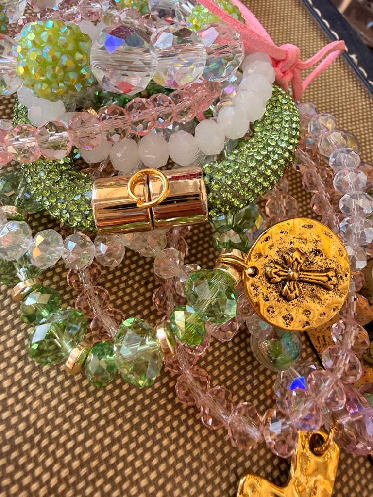 Soft, sweet, and full of charm 🌸💚 The Sweet Meadow Stack Bracelet Set features a dreamy mix of green and light pink tones with sparkling crystals and playful charm details throughout.