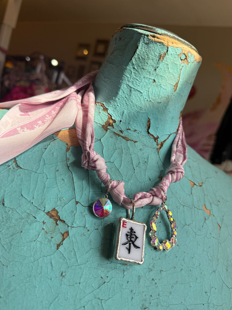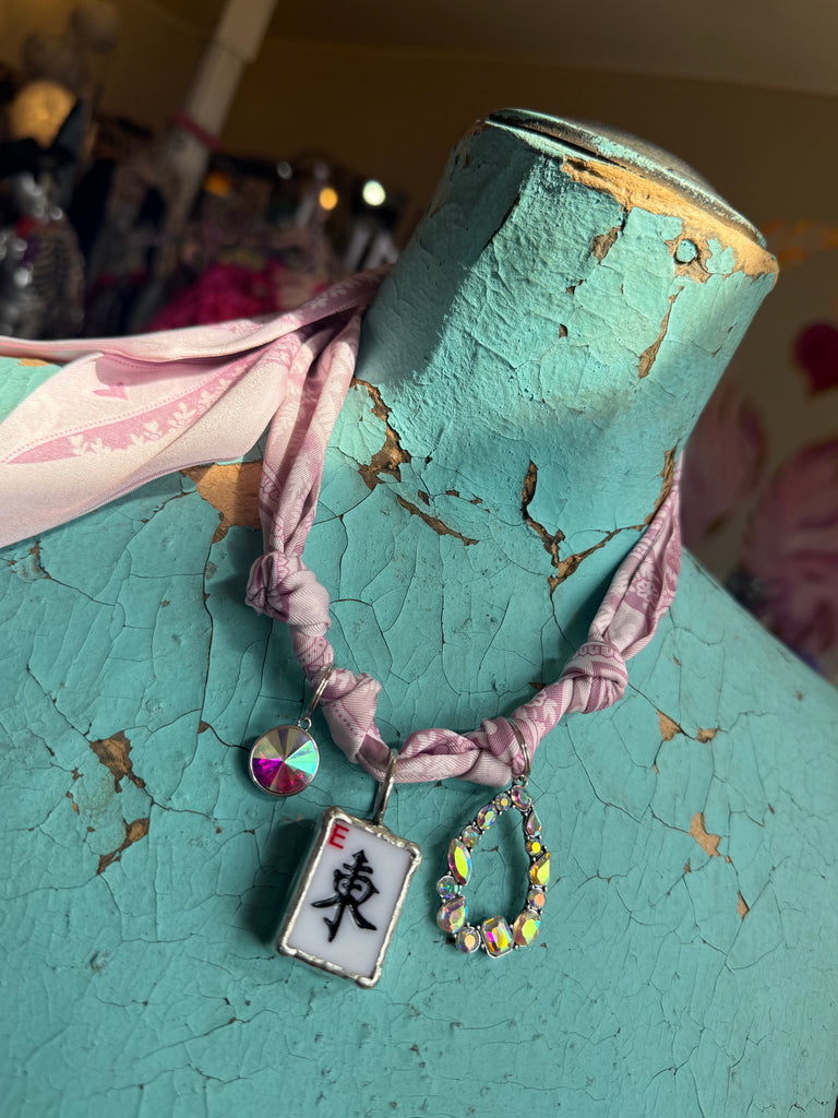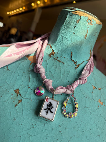 The East Wind Blossom Necklace celebrates renewal and creativity with its pink paisley scarf tie, real Mahjong tile pendant, and teardrop and round crystal accents. Soft, feminine, and full of lucky charm — perfect for adding meaning and color to your everyday look.
