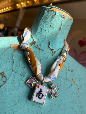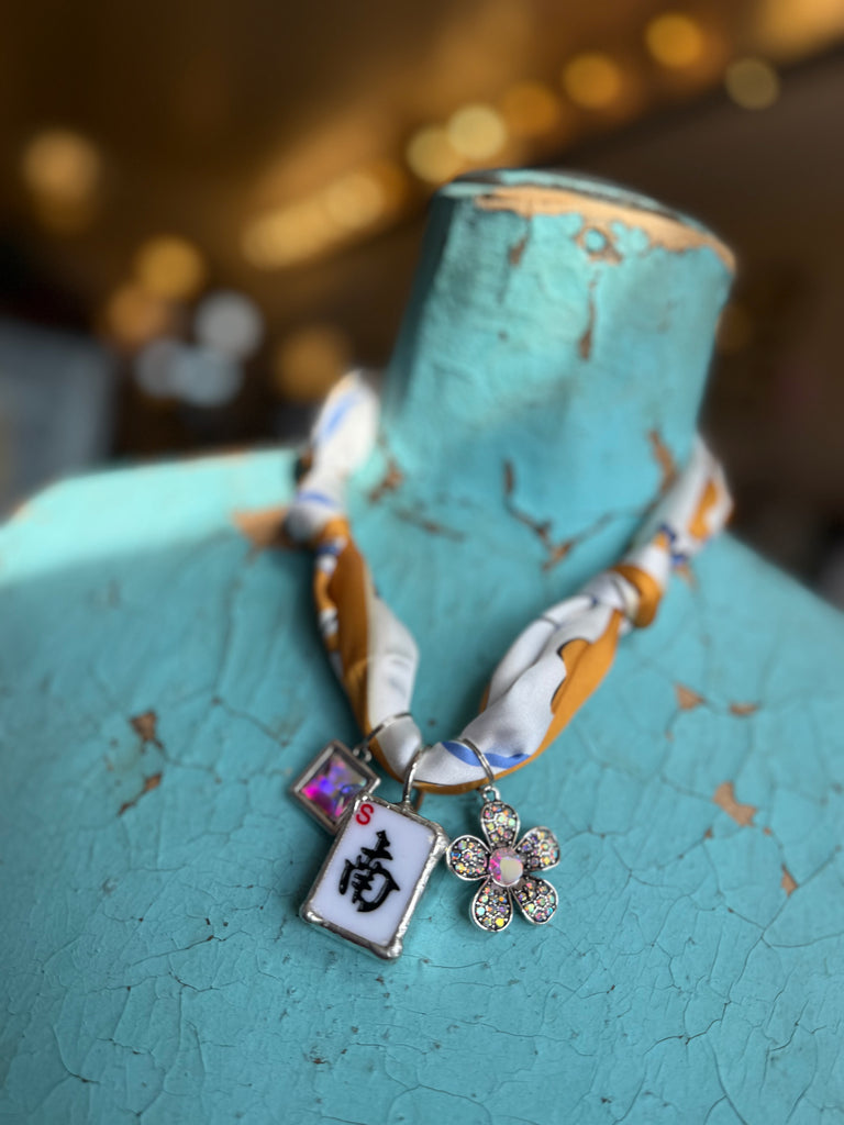 The South Wind Fortune Necklace symbolizes warmth and prosperity. A handmade Mahjong tile pendant is paired with a flower charm and a sparkling square crystal, creating a unique and balanced look that radiates good energy. Each necklace is handcrafted in Texas — one of a kind, just like you.