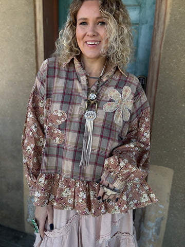 Sweet, free-spirited, and beautifully handmade in feel β€” the Wildflower Patchwork Peasant Top blends warm fall plaid with dainty floral sleeves and appliquΓ© blooms for that vintage-inspired Poetry Tea look. The relaxed fit, ruffled hem, and button neckline make it easy and flattering, while the mix of prints adds a touch of nostalgia and whimsy.
