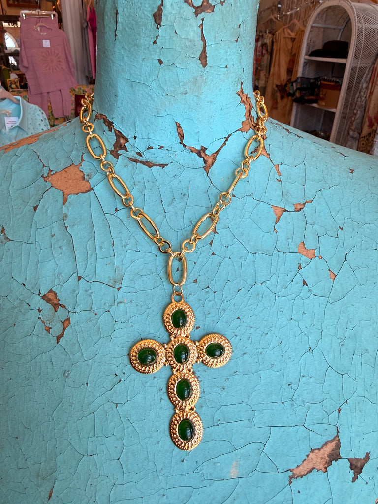A cross adorned with green gemstones creates a rich, meaningful statement with a touch of vintage glam. Handmade in Mississippi. Lead & nickel free.