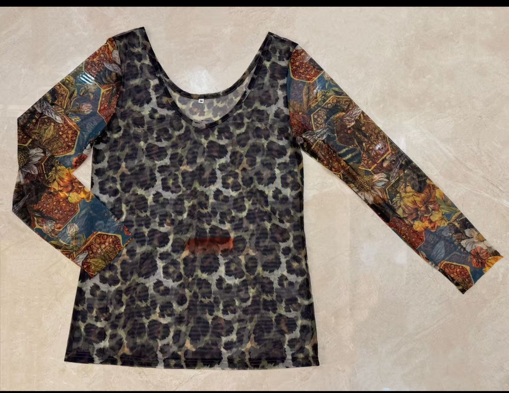 The Rare Bird Bee Mesh Top features a striking leopard print body paired with unique honeycomb bee-patterned sleeves. Designed with a flattering scoop neck and a great fit, this versatile piece works perfectly as a layering essential or a bold solo statement. Comfortable and stylish, it adds a touch of wild charm and playful detail to any wardrobe.