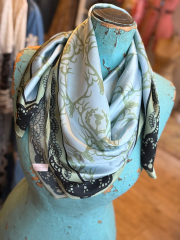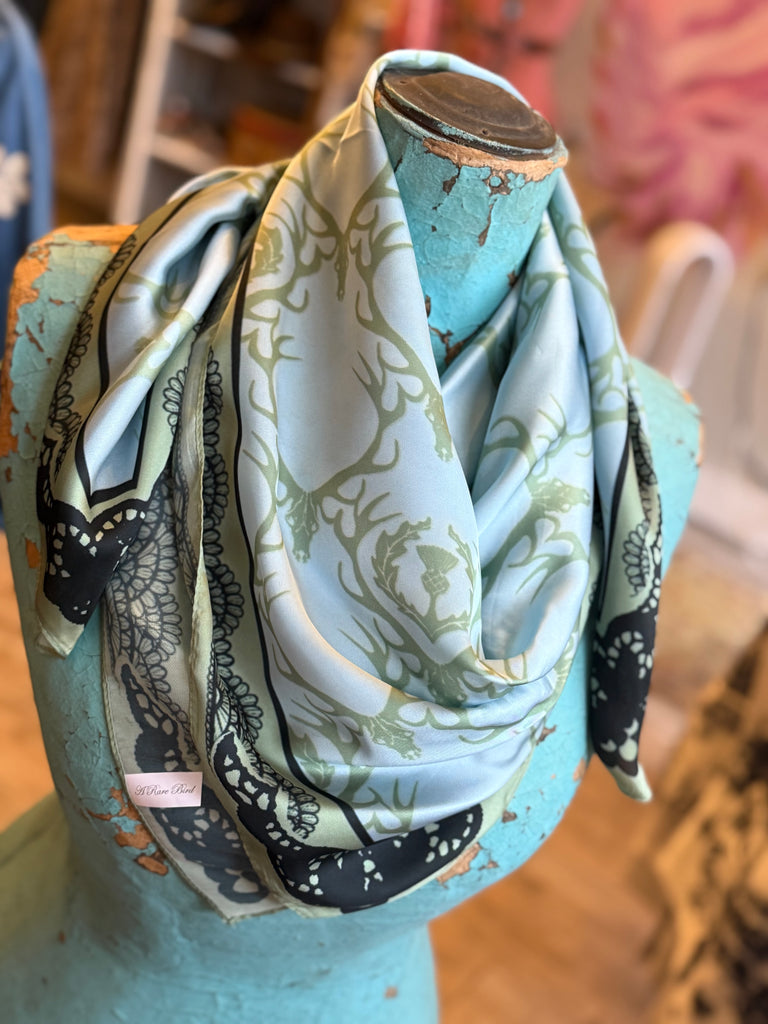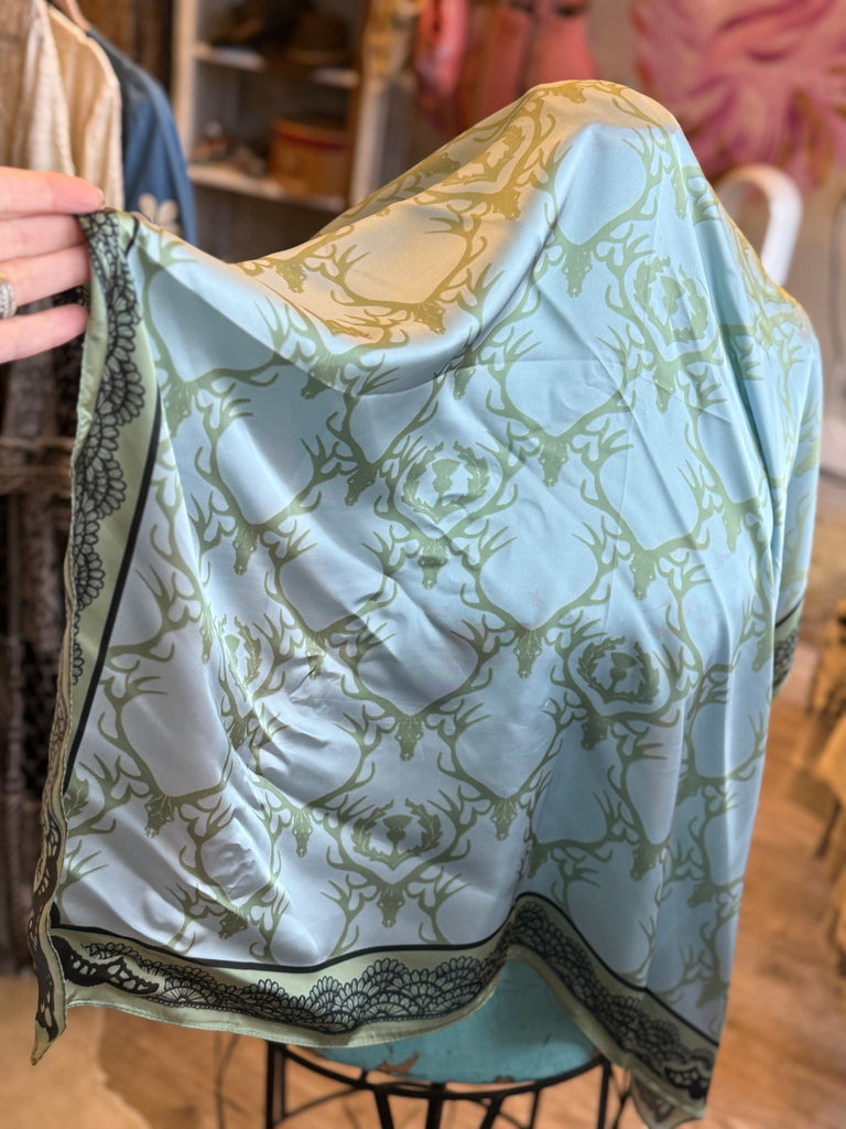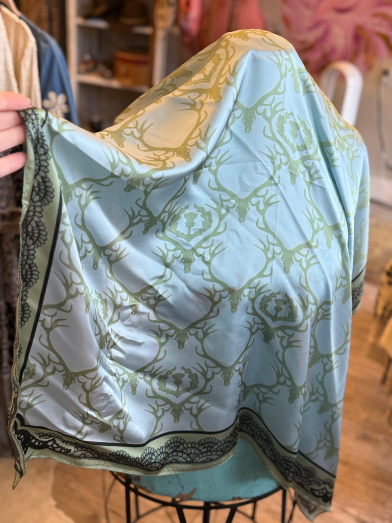 Inspired by the outdoors, this light blue and green wild rag showcases detailed deer heads framed by a black lace-inspired motif. Rugged yet refined, it brings a heritage hunting aesthetic into modern styling.
