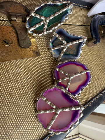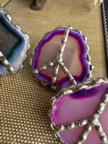 Beautiful natural agate meets bohemian spirit. These one-of-a-kind stretch rings feature hand-soldered peace signs — earthy, soulful, and full of artisan charm.