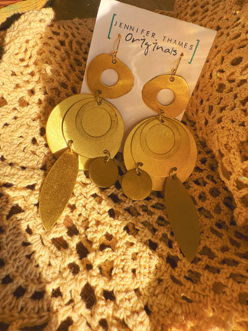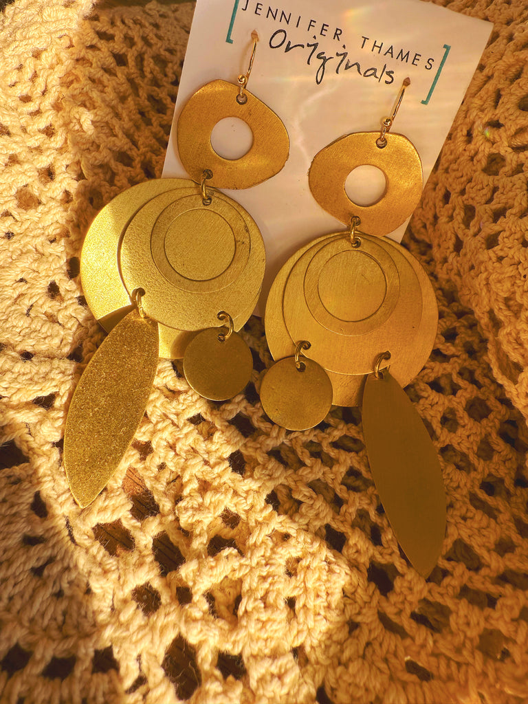 Artfully asymmetrical, these brushed gold earrings feature layered circular shapes for a modern, sculptural look. Lightweight and full of movement, they’re true wearable art.