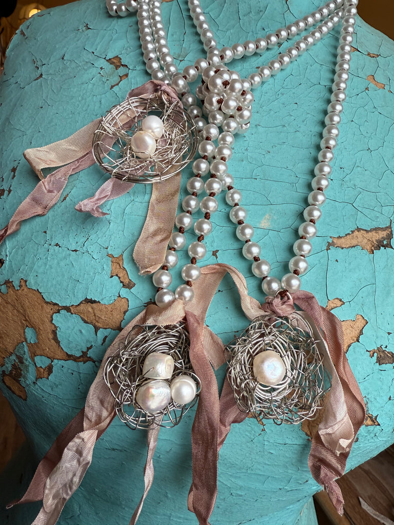 The nest is tied with beautiful hand-dyed ribbons for that romantic, shabby-chic Poetry Tea finish, all hung from a long strand of glossy pearls that feels both vintage and incredibly special.