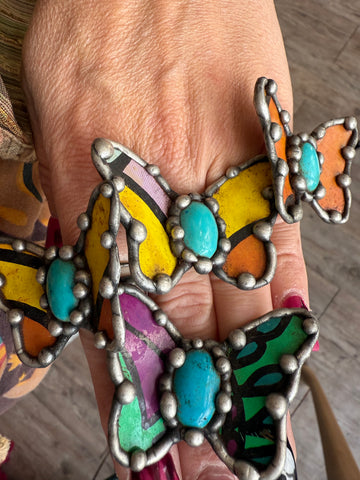 The perfect match to the cuff! This adjustable ring is handcrafted from the same vintage tin butterfly design with turquoise center stone and soldered detailing. Artsy, bold, and brimming with color — the ultimate conversation piece.