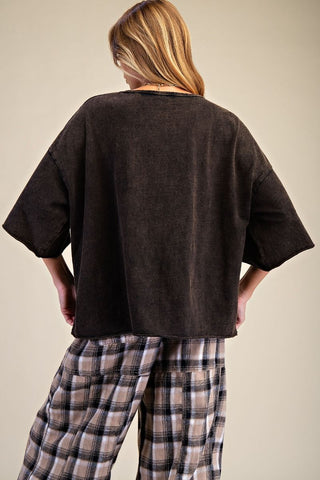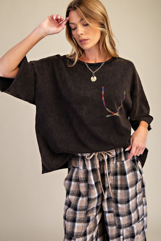 Perfectly worn-in and easy to love. The Desert Moon Graphic Tee is a boxy mineral-washed black tee with a touch of rainbow-stitched whimsy. The oversized fit and relaxed sleeve give it a carefree, lived-in vibe — just add plaid pants or denim and layered jewelry for that understated boho-cool look Poetry Tea is known for.