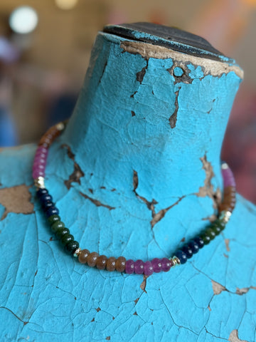 A rich, colorful take on a classic bead necklace. Featuring jade and agate stones in jewel tones of purple, gold, green, and blue, accented with gold for warmth and depth.