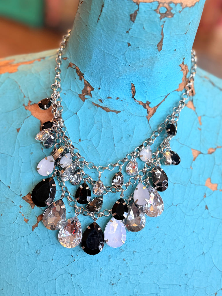 Dark, dramatic, and undeniably chic — the Midnight Drip Crystal Necklace features layered strands of black teardrop crystals for bold statement shine. The cascading crystal design adds dimension and movement while remaining lightweight and easy to wear.