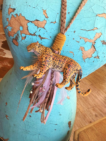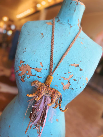 Introducing the Nomad Necklace — a wildly unique, hand-crafted boho statement from A Rare Bird. Featuring a sculpted cheetah pendant full of personality and detail, this piece flows into a cascade of feathers, braids, leather, ribbons, and shimmering accents. Every strand adds texture and movement, giving the necklace a soulful, free-spirited feel.