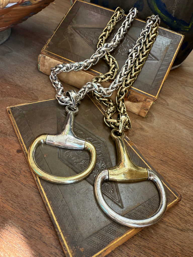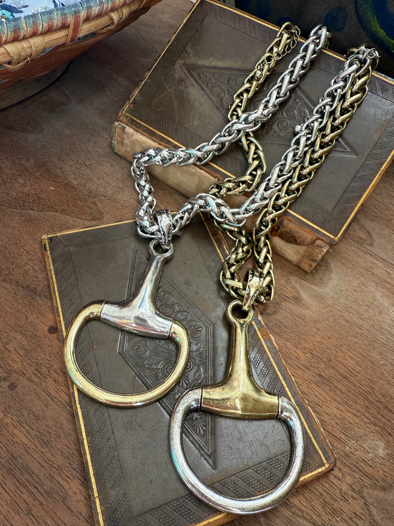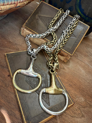 Meet the Saddle & Shine Designer Necklace — a stunning mixed-metal statement piece inspired by iconic designer equestrian motifs. Featuring a bold, oversized horse bit as the centerpiece, this necklace blends gold and silver tones for a rich, sophisticated look that pairs beautifully with everything from cozy sweaters to dressy nights out.