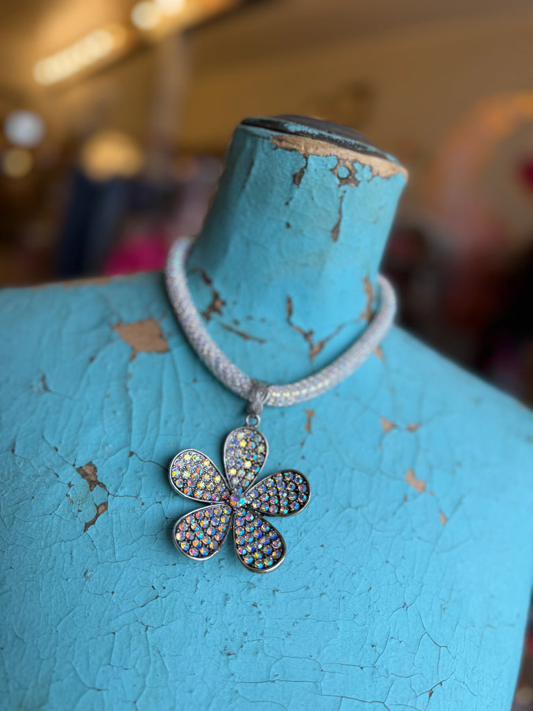 Meet the Stardust Daisy Statement Necklace — a dazzling, over-the-top showstopper that mixes groovy flower-power charm with major boutique glam. The thick, shimmering AB crystal rope catches the light from every angle, leading down to a bold five-petal daisy pendant covered in radiant, rainbow-shifting crystals.