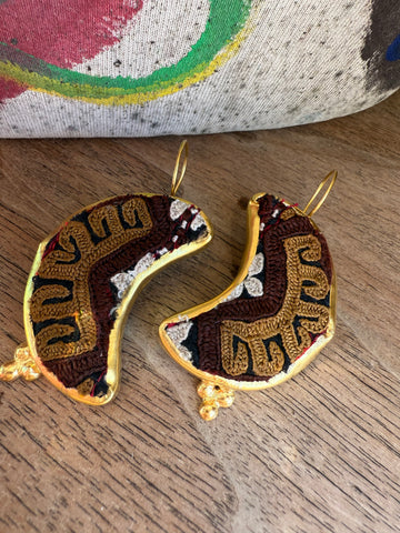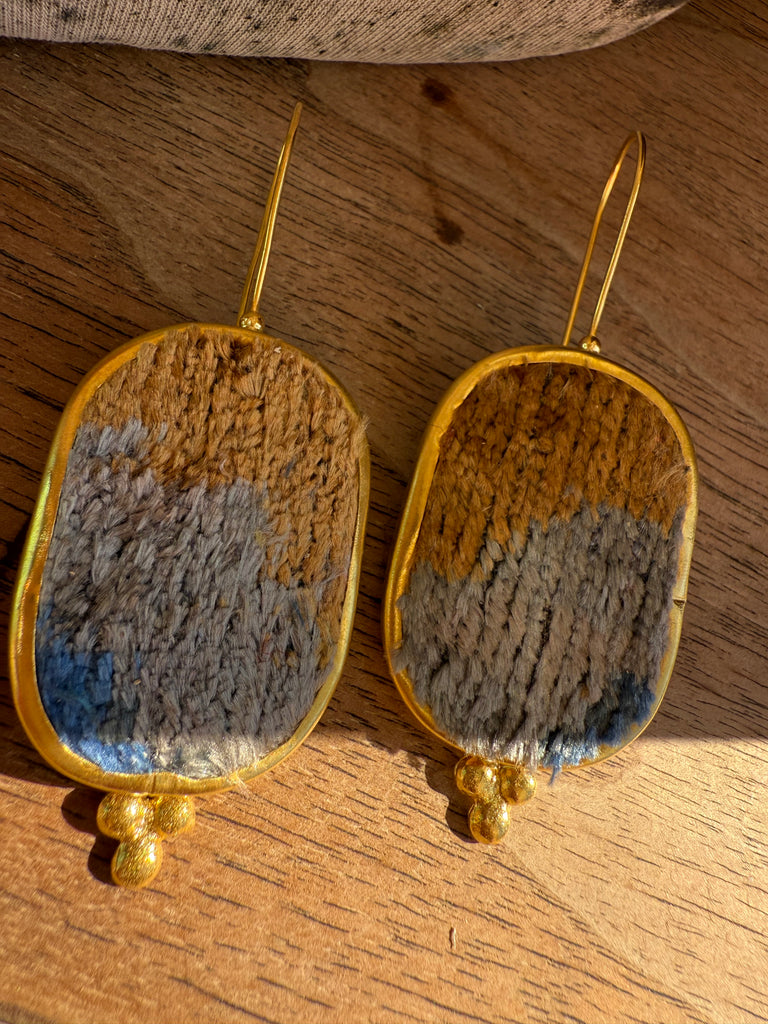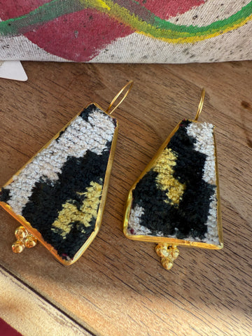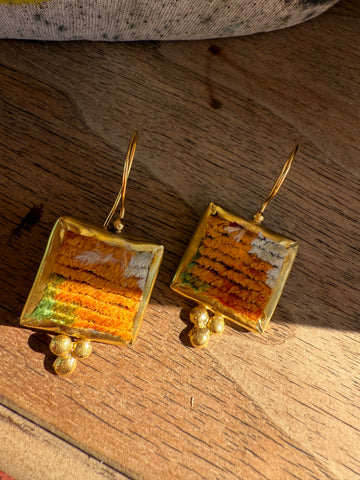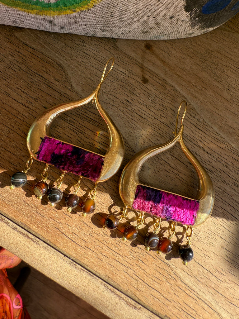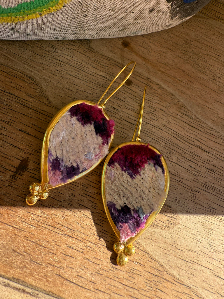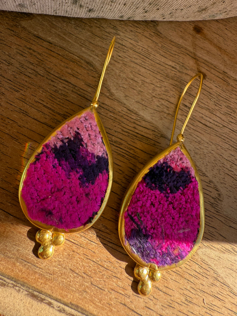 Handcrafted in India from reclaimed velvet tapestry scraps, the Velvet Mosaic Earrings are wearable works of art — no two pairs are ever alike. Each set features rich colors, unique shapes, and luxe texture, making them the ultimate statement in bohemian individuality. Lightweight with easy shepherd’s hook backs, they’re comfortable enough for everyday wear yet bold enough to steal the show.