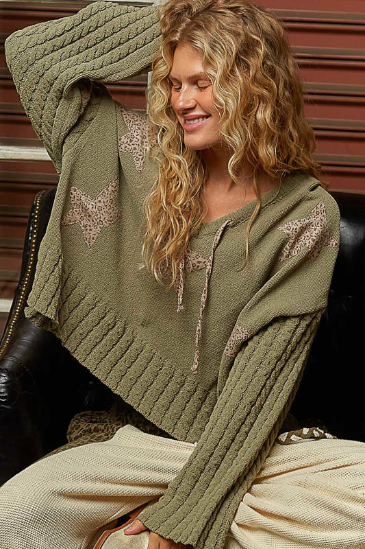 Cozy meets playful in the Wild Olive Chenille Hoodie. This V-neck, cropped sweater hoodie features cable-knit sleeves, patchwork star details in leopard print, and a pointed solid pattern for a fun, textured look. Crafted in medium-weight chenille, it’s perfect for layering or wearing on its own for a relaxed, stylish vibe.