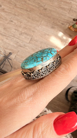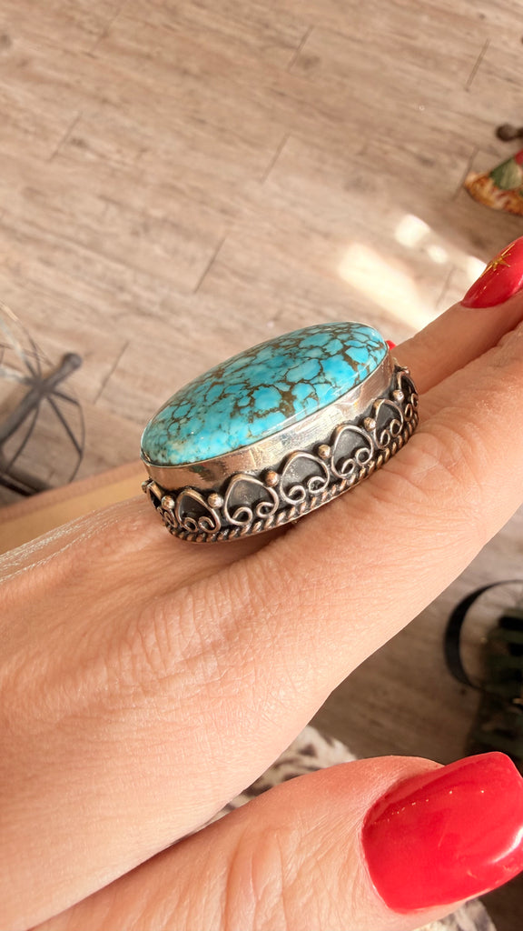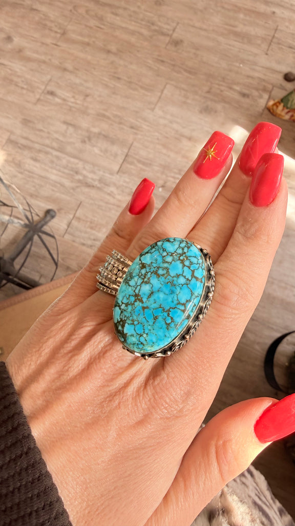 Raw, organic beauty at its finest — the Wild Vein Turquoise Ring features a striking natural turquoise stone with rich, visible veining that makes every piece one of a kind. Set in German silver with etched side detailing, this ring blends rustic elegance with artisan craftsmanship. Adjustable fit makes it easy to wear on any finger.